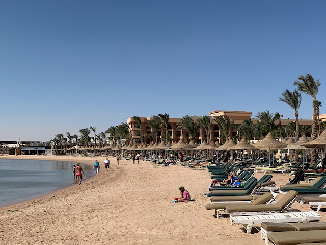 So sah es heute Vormittag in Hurghada aus, genauer gesagt am Strand des Giftun Hotels. Die Urlauber, die noch vor Ort sind, machen das Beste aus der Situation und geniessen noch Sonne und Meer. Falls man es nicht besser wüsste, könnte dies auch ein Bild von einem ganz normalen Urlaubstag sein.