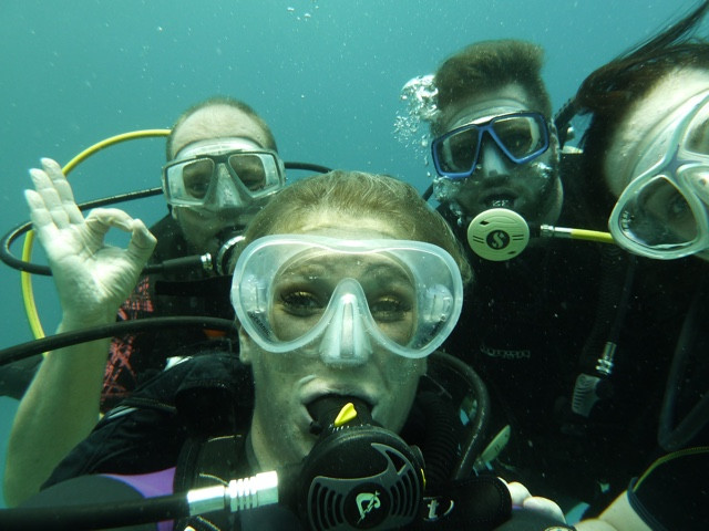 Khaled, Tom und seine 6 Tauchkursschüler Eric, Lukas, Patrick, Nina, Sabrina und Dominik (2. Bild, s. weißer Punkt oben rechts im Bild) haben vor kurzem erfolgreich ihren Open Water Diver Kurs abgeschlossen. Dies ist der Startschuss der PADI Kurse.