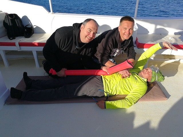 Rette sich wer kann – wir haben zwei neue Rescue Diver. Marcus und Michael schnappten sich nach dem Kurs gleich Tauchlehrer Hermann zur Reanimation. Was die Boje dabei soll, wollen wir uns lieber nicht vorstellen … Ob das eine Rache war für den Drill im Rescue Kurs? Wir wissen es nicht.