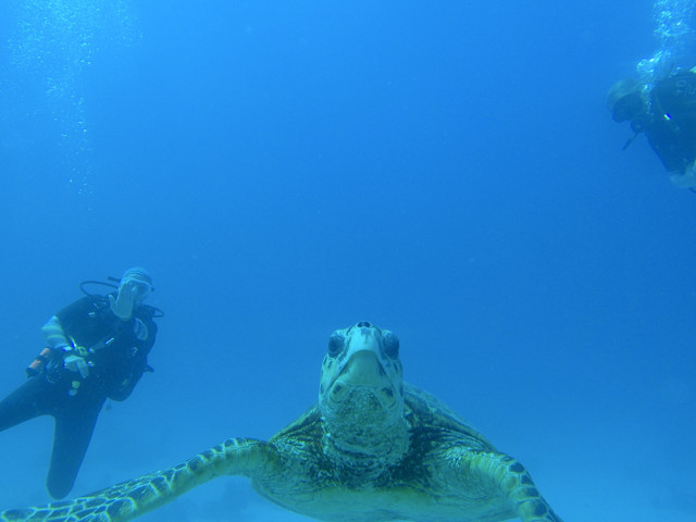 Auch die Taucher rund um unseren Diveguide Eva konnte Schnappi letztens kennen lernen: “ Die Schildkröte ging minutenlang auf Kuschelkurs. Anfangs war das noch sehr amüsant, doch dann waren wir froh als sie zum Luft holen hoch musste und wir uns schnell aus dem Staub machen konnten.“
