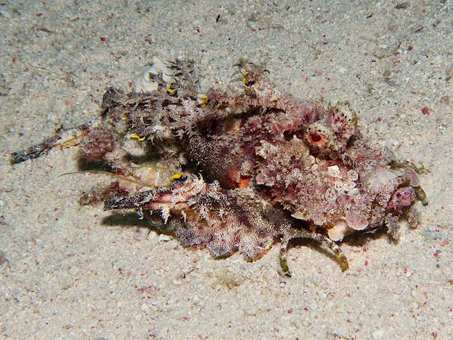 Der Filament-Teufelsfisch (so sein richtiger Name) gehört zur Unterfamilie der Steinfische und kann bis zu 25 cm groß werden und besitzt Giftstachel. Er hat wie Krallen aussehende Beinchen an den Brustflossen und kriecht am Meeresgrund entlang. Wenn Gefahr droht, breitet er seine farbenprächtigen Brustflossen zur Warnung aus.