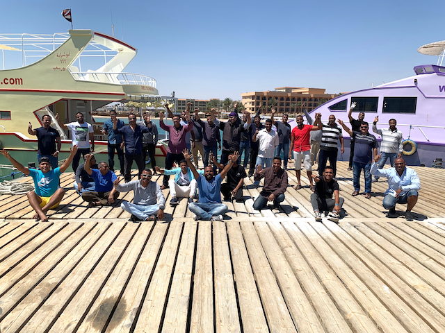 Obwohl die Boote in den zwei Wochen von unseren ägyptischen Kollegen Achmed und Hisham betreut wurden (wir berichteten), wollten unsere Crews natürlich ihre schwimmenden Arbeitsplätze wiedersehen. So kamen dann auch Kapitäne und Mannschaften zusammen um nach dem Rechten zu sehen. Die Gelegenheit wurde genutzt um gleichzeitig einen Gruss an alle Gäste und Freunde zu senden!